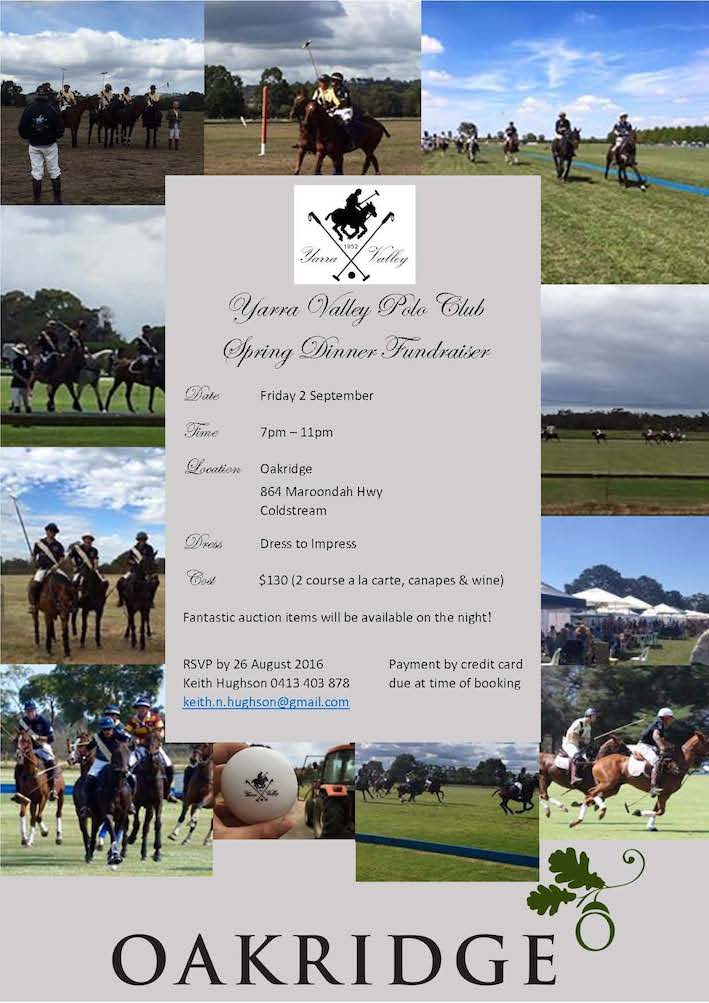 The Yarra Valley Polo Club invite you to their Spring Dinner Fundraiser on Friday 2nd September 2016 at Oakridge (864 Maroondah Hwy, Coldstream) from 7pm - 11pm.