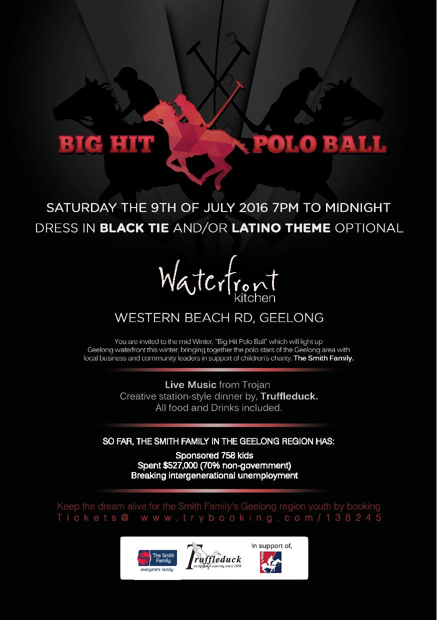 You are invited to the mid Winter "Big Hit Polo Ball" which will light up the Geelong waterfront this winter, bringing together the polo stars of the Geelong area with local business and community leaders in support of children's charity - The Smith Family.